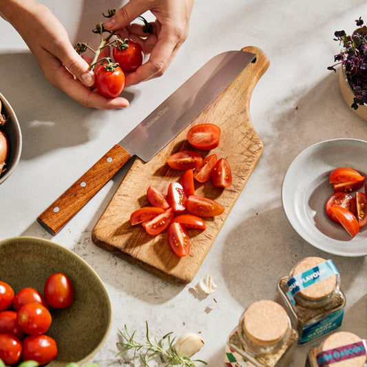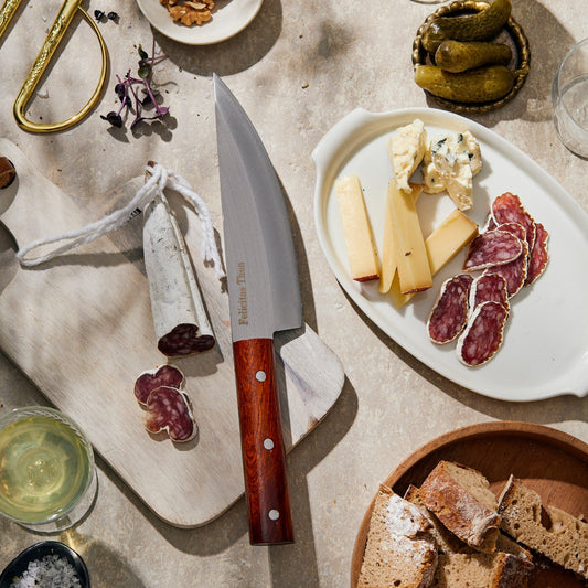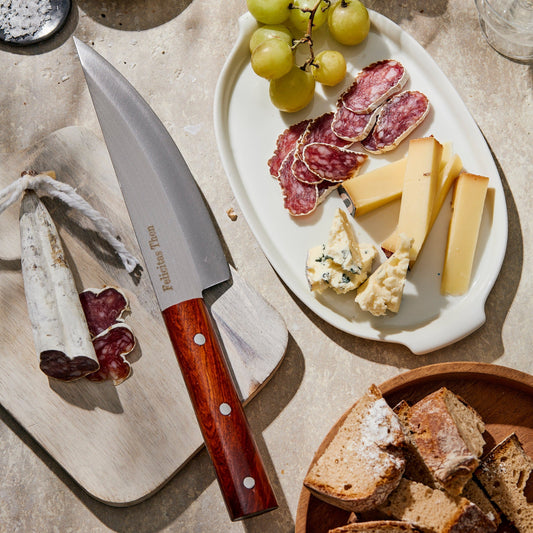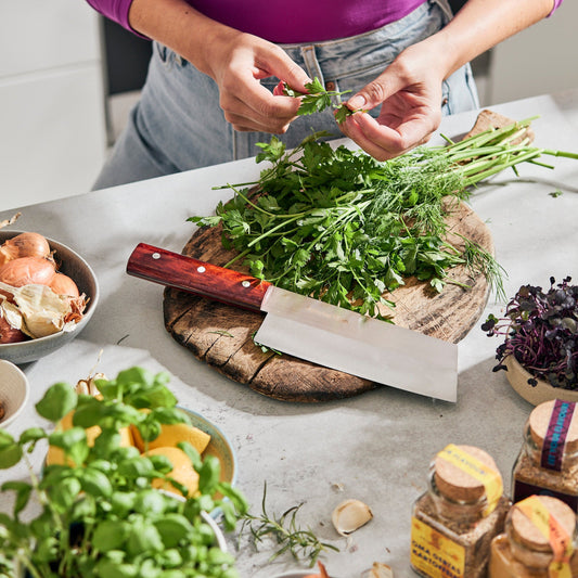 Nicht ohne meine Messer! Nichts ist in der Küche essentieller als das richtige Messer. Dabei hat jede und jeder andere Vorlieben, Techniken und Kochgewohnheiten. Entsprechend vielfältig fällt mein scharfes Sortiment aus. Seit 2016 lasse ich jedes einzelne Messer von einer kleinen Manufaktur in Vietnam in Handarbeit fertigen, schleifen und gravieren.