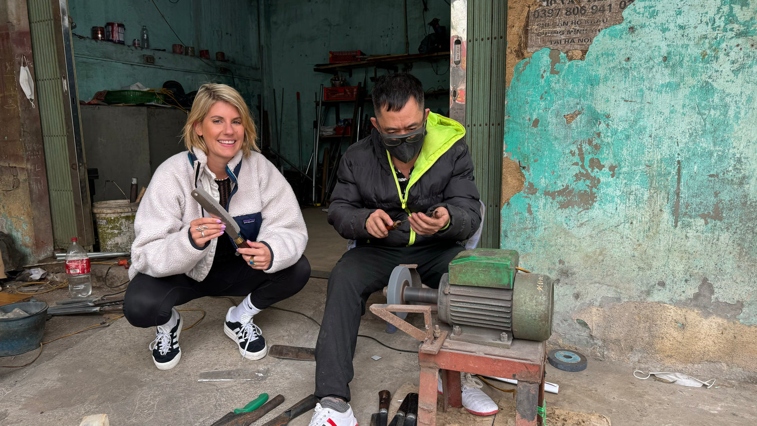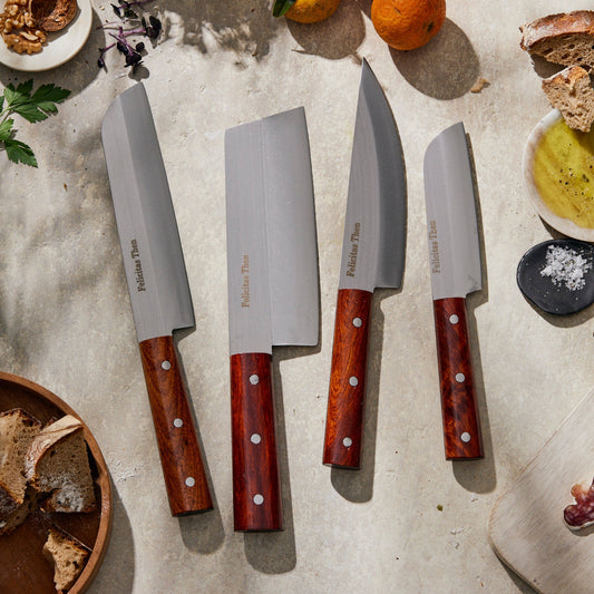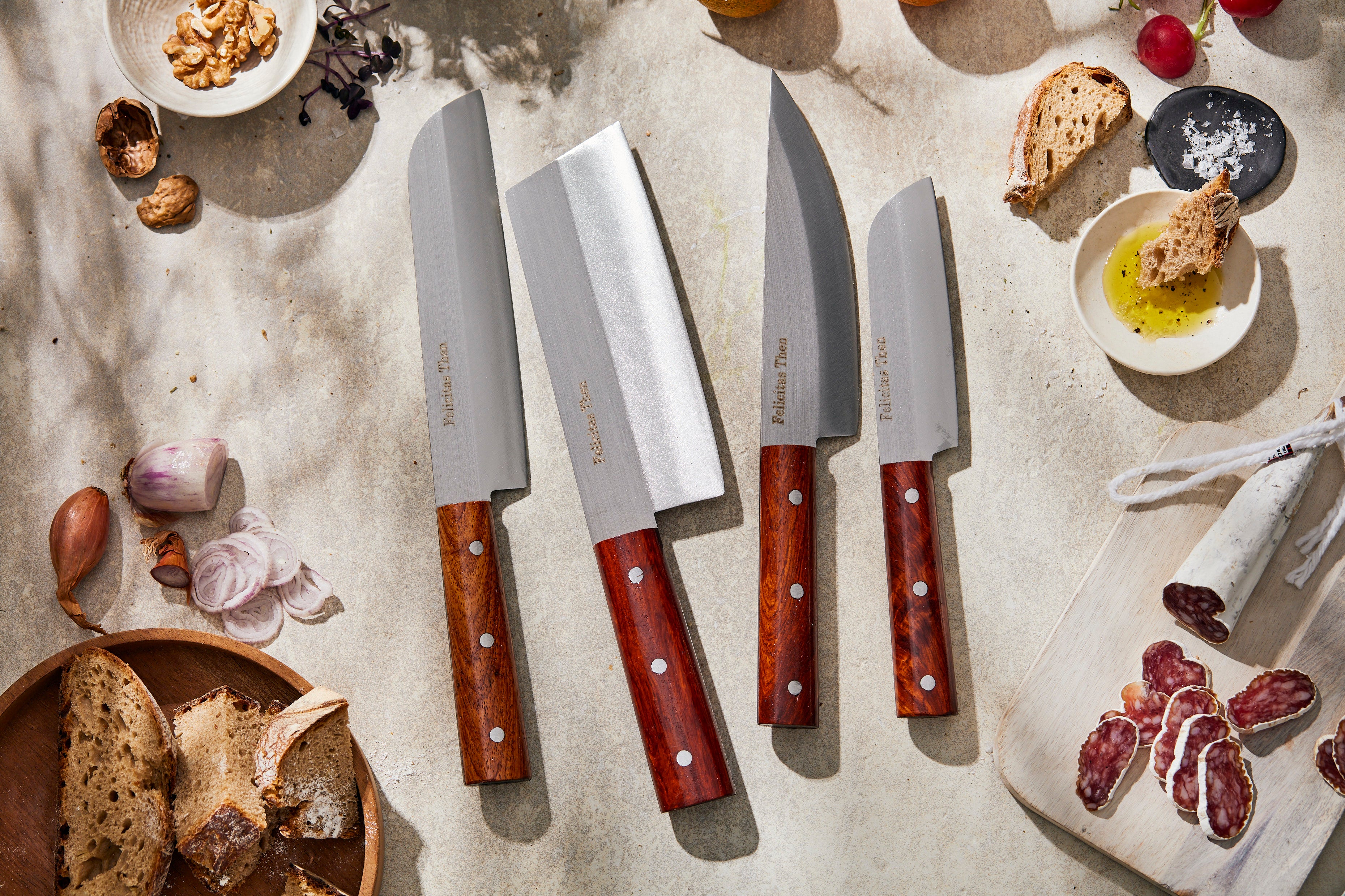 Seit 8 Jahren arbeite ich schon mit der Messer-Familie in Hanoi zusammen! Dieses Jahr im Februar haben wir eine neue Kollektion entwickelt, rostfrei und mit tollem Holzgriff.